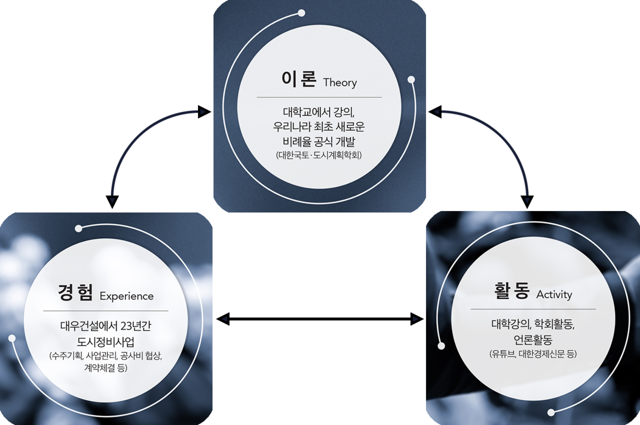 도시정비사업은 추정분담금, 공사비, 용적률 등과 같은 복잡한 변수로 이루어진 사업입니다. 추정분담금은 조합과, 공사비는 시공사와, 용적률은 정부와 밀접한 관계를 가지고 있습니다. 이러한 관계속에서 서로 다른 이해와 목적에 의해 여러가지 문제가 발생되기도 합니다. 도시정비 공사비ㆍ분담금 검증 연구원은 이러한 관계속에서 발생하는 문제들을 23년 동안 대표이사의 도시정비사업에 대한 실제적인 경험과 우리나라 최초로 새로운 비례율 공식을 만들내는 등 깊이있는 이론을 바탕으로 여러가지 문제의 다양한 해결책(Solution)을 제공하고자 합니다. 도시정비사업에 대한 정부, 조합, 시공사 등의 공사비, 분담금, 사업추진에 대한 다양한 걱정과 고민을 함께 하겠습니다.